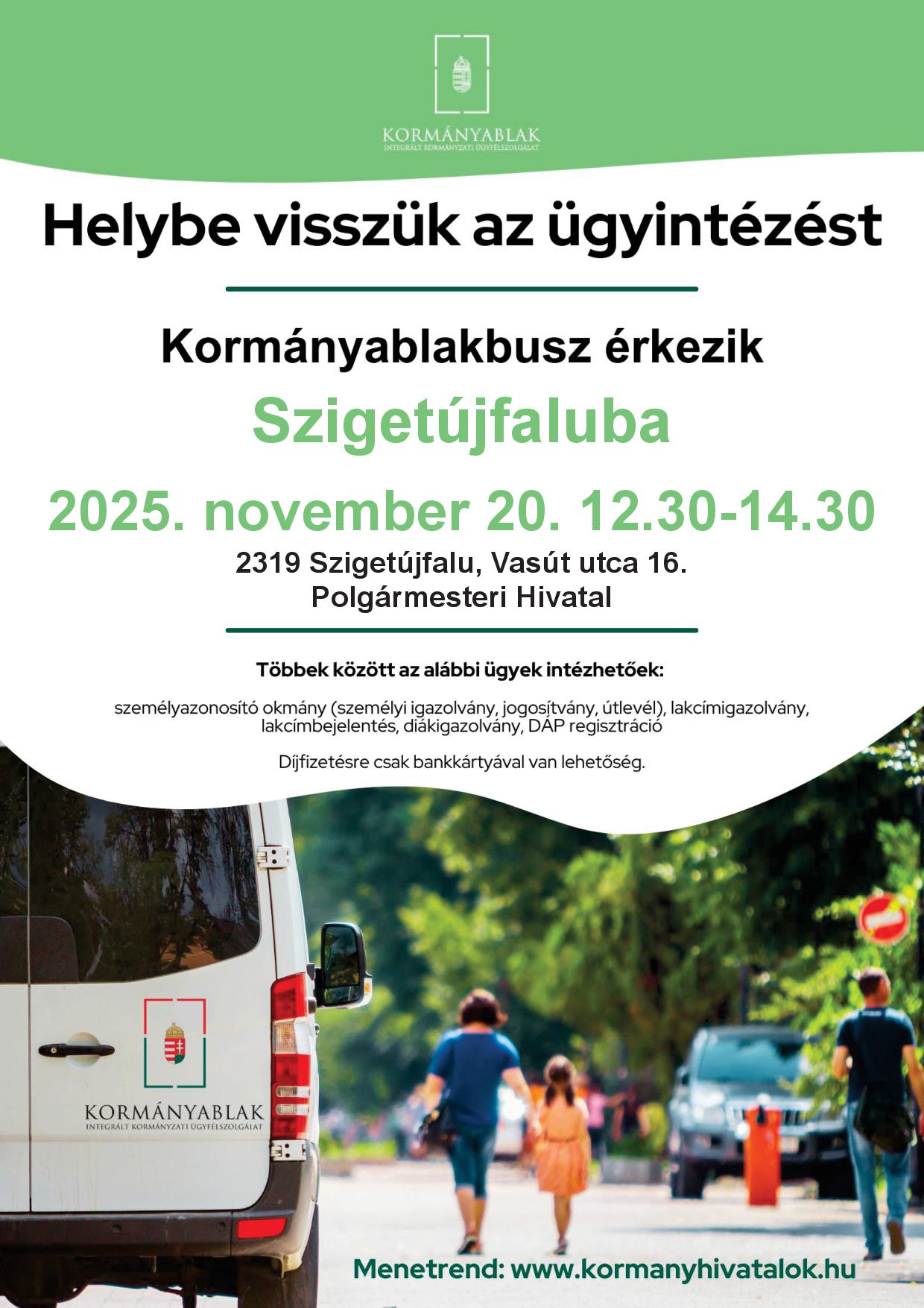 Tájékoztatjuk a Tisztelt Lakosságot, hogy 2025. november 20-án 12.30-14.30-ig Kormányablak-busz érkezik Szigetújfaluba, a Polgármesteri Hivatalhoz.